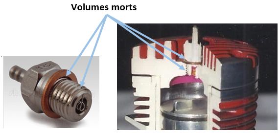 Deux autres détails, qui n'en sont pas quand on cherche des mm3 de compression, sont le jeu de filetage de la bougie et le petit espace entre la rondelle d’étanchéité et la bougie. C’est d’ailleurs pour éviter ces volumes morts que les bougies "turbo", à étanchéité par cône au plus près du filament, se sont généralisées sur les moteurs de voiture RC.