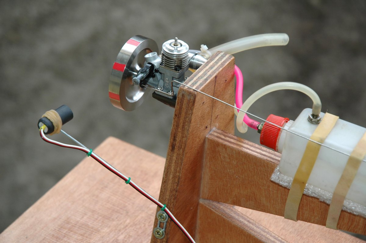 Le moteur retenu pour les tests est un AP 06 (équipé sur cette photo d'un volant d'inertie, permettant de mesurer en un seul essai les courbes de couple et puissance), utilisé avec un carburant maison spécial 1/2A (10% nitro, 13% huile de ricin dégommée, 10% huile Micro Motul, 1% anti-usure) :